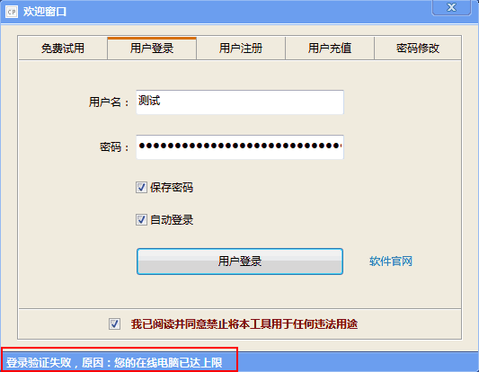 网络版登录时,如果底部状态栏显示“在线电脑已达上限”或类似提示(如下图),则说明当前用户同时登录电脑数量已达到3台。 注:正常注册充值用户,最多可登录3台电脑同时使用。 解决方法: 1、通用模式 退出一台已登录电脑后,等待5-10分钟,即可尝试登录新电脑。 2、24小时离线模式 退出一台已登录电脑后,需等待此电脑自登录时间开始后24小时,再尝试登录新电脑。 或者可联系一翔(QQ:2117068717 Email:yxtools2022@126.com)后台清除已登录电脑状态后,再进行尝试。