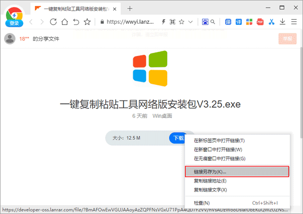 11、重新打开下载页面,右键点击安装包下载按钮,将文件另存到刚刚添加的排除项目录中。