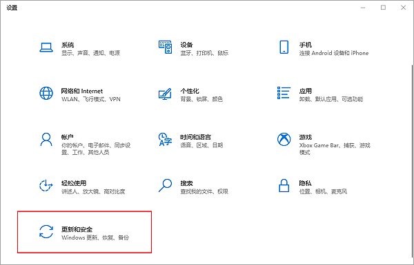 3、在“Windows设置”窗口中,点击底部的“更新和安全”按钮。