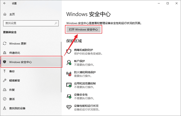 4、点击左侧的“Windows 安全中心”分类,然后在右侧点击“打开 Windows 安全中心”按钮。
