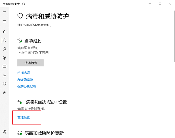 6、接着点击 病毒和威胁防护 “管理设置”按钮。