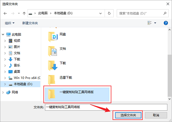 9、选择第一步中创建的文件夹,例如这里我们选择 D 盘根目录下的“一键复制粘贴工具网络版”文件夹,然后点击“选择文件夹”按钮。